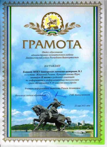 Кутлугаллямов Нур - грамота победителя олимпиады по информатике,2012 г. |